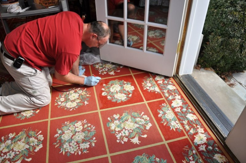 Here's an example of a color restoration that we did after a carpet cleaning company tried to clean up a stain in the middle of the Marine Corps' band room in NW Washington, DC.