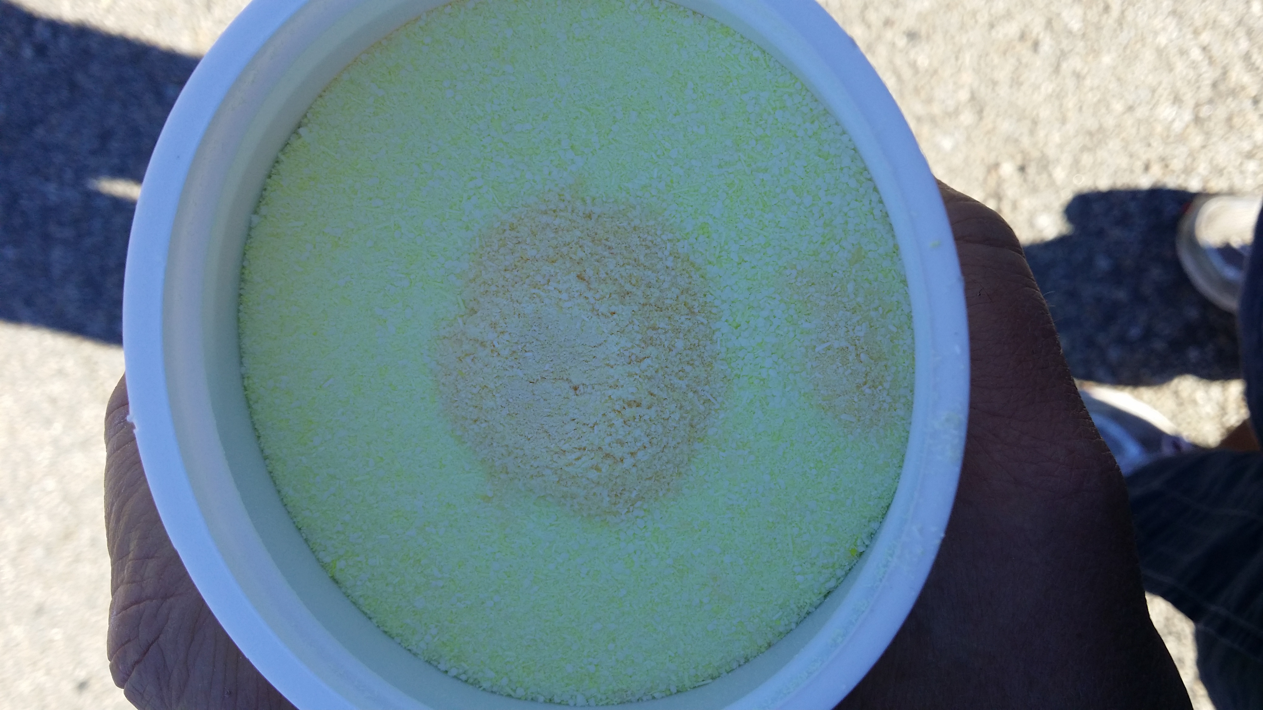 The wash tub was prepared for normal use. One cup of Di-Chor (typical product used in swimming pools and hot tubs), one quart of Secret Sauce, and one quart of Knock-Out. A brand new uncontaminated rug was put into the wash tub and the sewage contaminated rug was put in as well after it was flushed by rinse in the centrifuge. (The sewage contaminated rug still had high levels of unhealthy contaminates in it after flushing, although reduced from levels we had when it came out of the bag.) Even with high readings on containments on sewage rug, we nonetheless washed both rugs in the same tub simultaneously for a period of time – 90 minutes. We were testing each respective rug at specific increments of time during the duration of a wash.