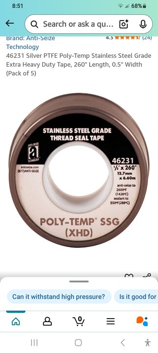 You're welcome, that's one of the things i picked up working around shipboard turbine engines the nickel infused in the tape helps prevent threads from galling. There is other sealant tapes that is supposed to be "stainless compatible" like blue monster tape and are ok when stainless goes to brass or soft steel but for stainless on stainless i only use stainless teflon tape ( blue monster is my go to sealant tape for all other applications)Never knew that....thanks Dwain!
